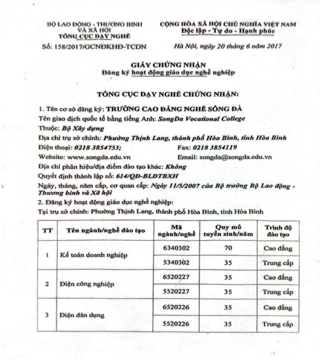 Giấy phép đăng ký hoạt động giáo dục nghề nghiệp Ngày đăng: 18-12-2025 Bài viết liên quan Giấy chứng nhận đăng ký bổ sung hoạt động GDNN Ngày đăng: 15:19 18/12/2025 Giấy phép đăng ký hoạt động giáo dục nghề nghiệp Ngày đăng: 15:15 18/12/2025 Quyết định thành lập trường Ngày đăng: 15:07 18/12/2025