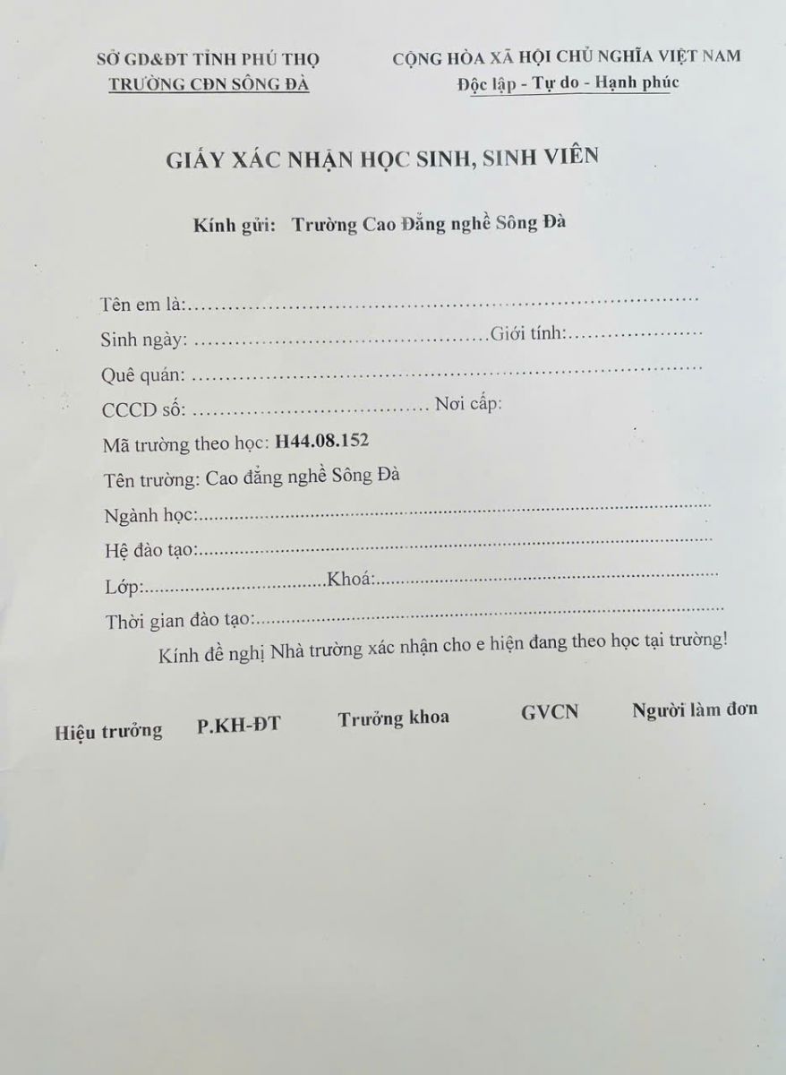 Mẫu đơn: Giấy xác nhận học sinh, sinh viên Ngày đăng: 30-03-2026 Bài viết liên quan Mẫu đơn: Xin học lại, học bổ sung Ngày đăng: 16:22 30/03/2026 Phiếu đăng ký dự tuyển vào giáo dục nghề nghiệp Ngày đăng: 15:51 30/03/2026 Mẫu đơn đề nghị miễn, giảm học phí Ngày đăng: 15:48 30/03/2026 Đơn đề nghị cấp chính sách nội trú Ngày đăng: 15:44 30/03/2026 Mẫu đơn xin trợ cấp xã hội Ngày đăng: 15:23 30/03/2026
