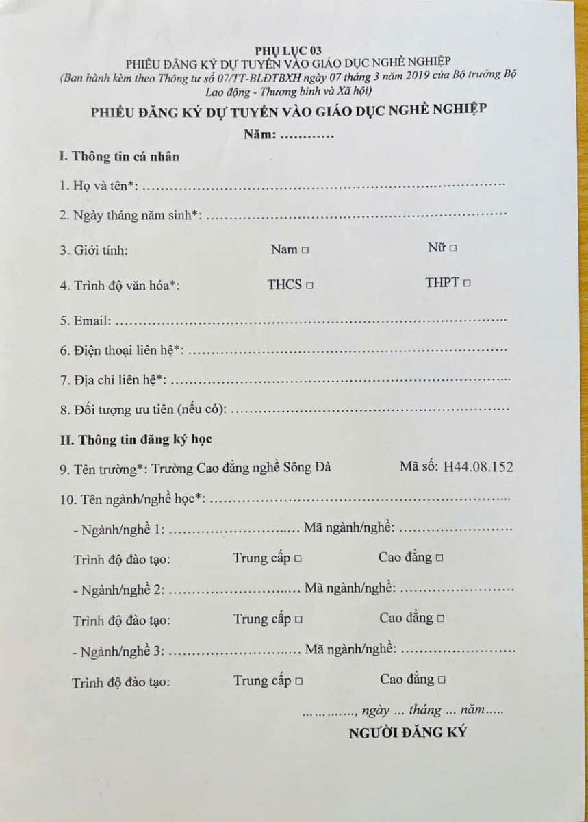 Phiếu đăng ký dự tuyển vào giáo dục nghề nghiệp Ngày đăng: 30-03-2026 Bài viết liên quan Mẫu đơn: Giấy xác nhận học sinh, sinh viên Ngày đăng: 16:24 30/03/2026 Mẫu đơn: Xin học lại, học bổ sung Ngày đăng: 16:22 30/03/2026 Mẫu đơn đề nghị miễn, giảm học phí Ngày đăng: 15:48 30/03/2026 Đơn đề nghị cấp chính sách nội trú Ngày đăng: 15:44 30/03/2026 Mẫu đơn xin trợ cấp xã hội Ngày đăng: 15:23 30/03/2026